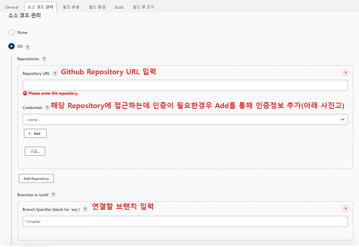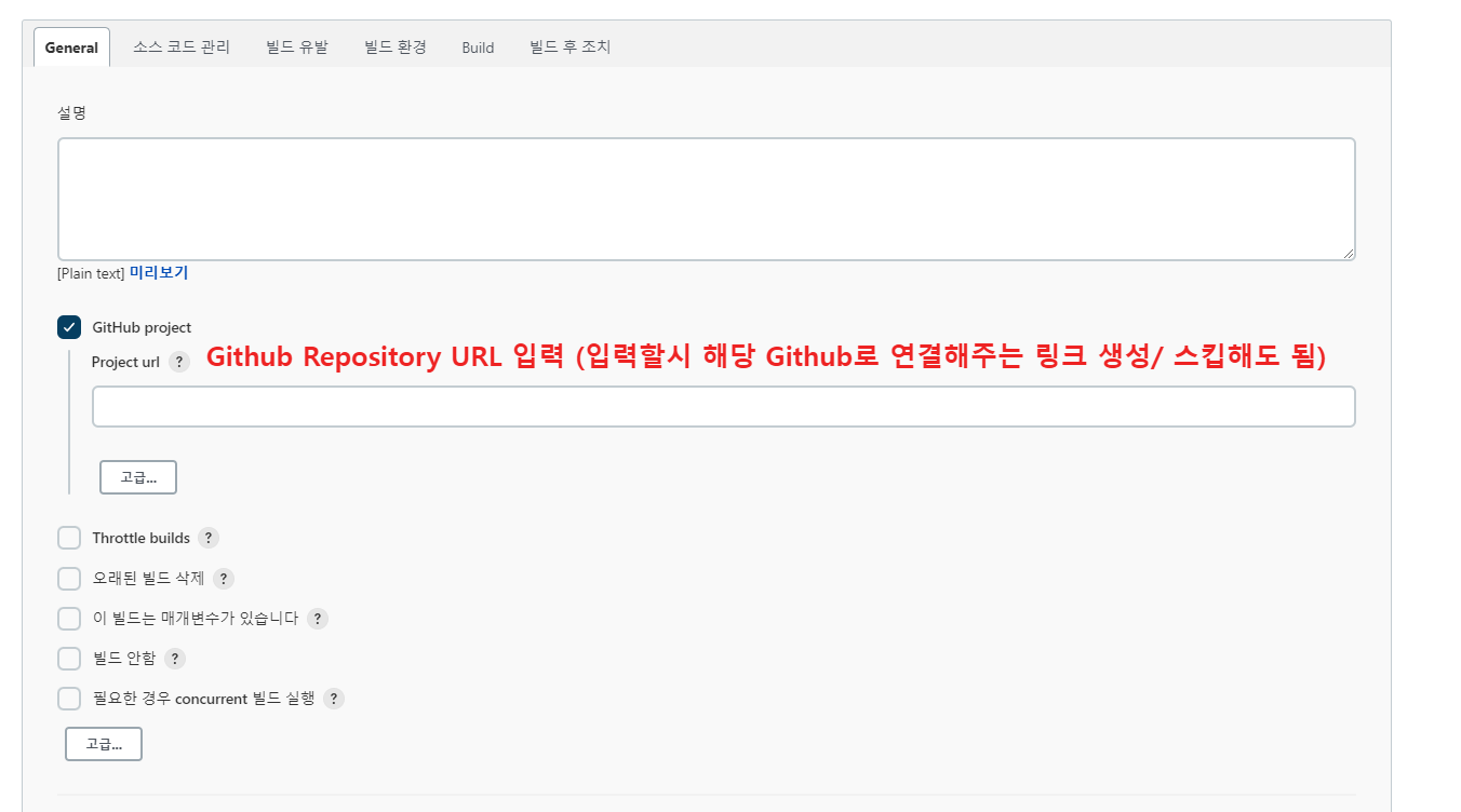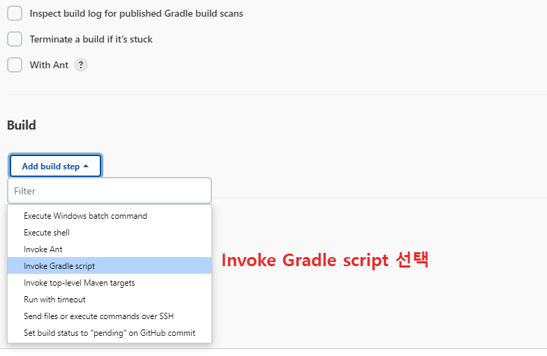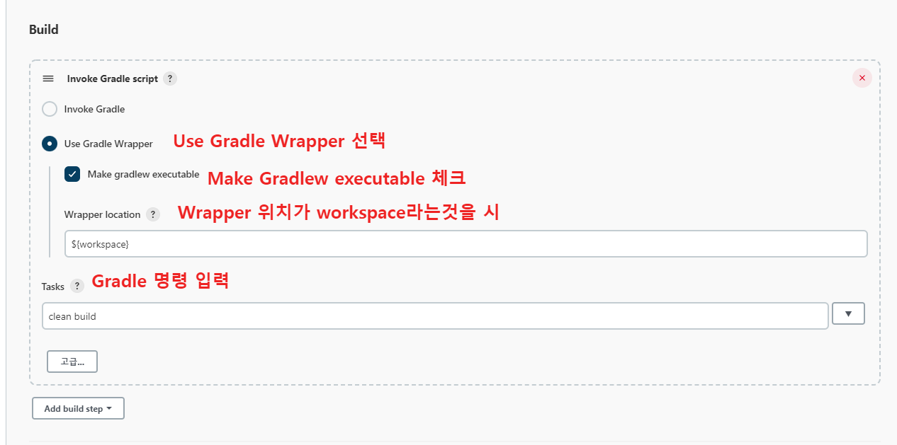 만약 gradlew,wrapper,setting.gradle 같은 gradle 파일이 github repository상에 올라가있어 github pull만으로 gradle 실행이 가능하다면 아래와 같이 설정을 입력한다. 아닐경우 Jenkins 관리 -> 시스템 설정에서 gradle 설정을 추가로 해주어야 한다.
