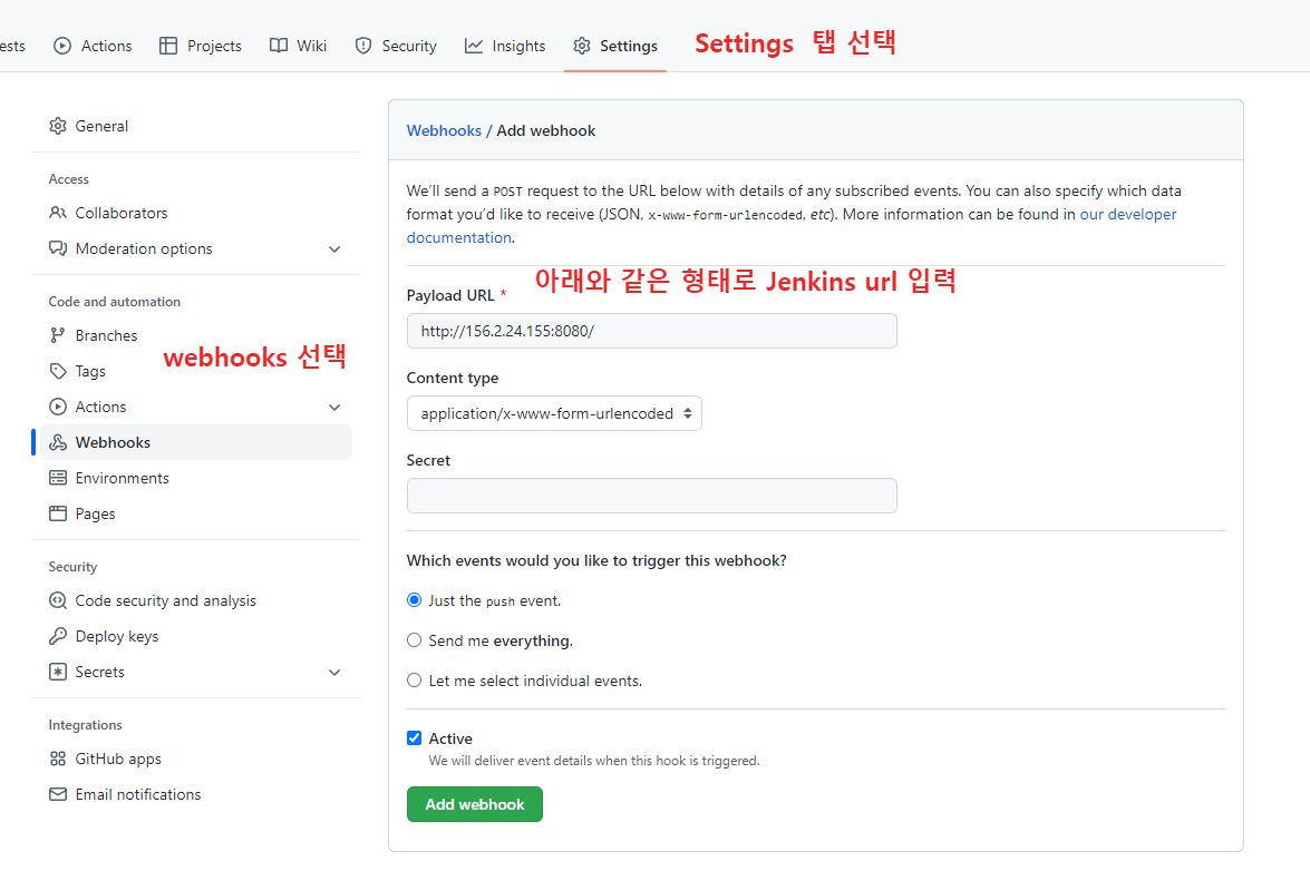 그다음 빌드 유발을 자동으로 하기위해 연결한 Github Repository에서 setting -> webhooks -> add webhook 에서 jenkins의 url을 입력한다.