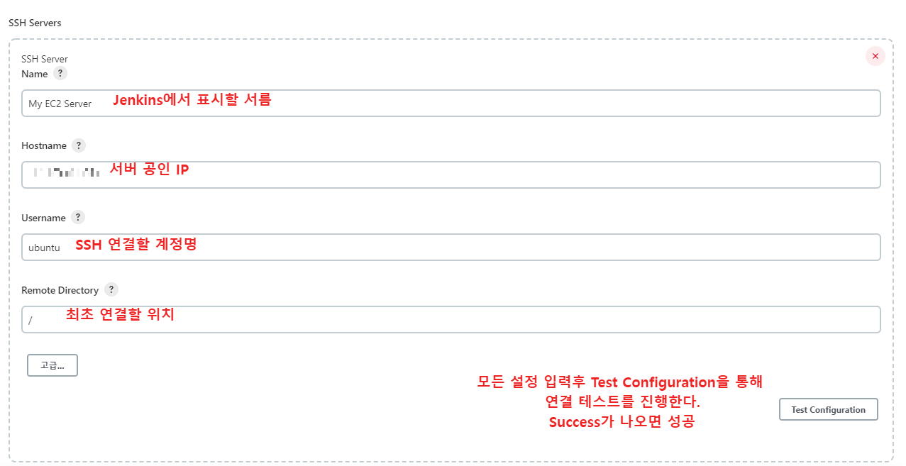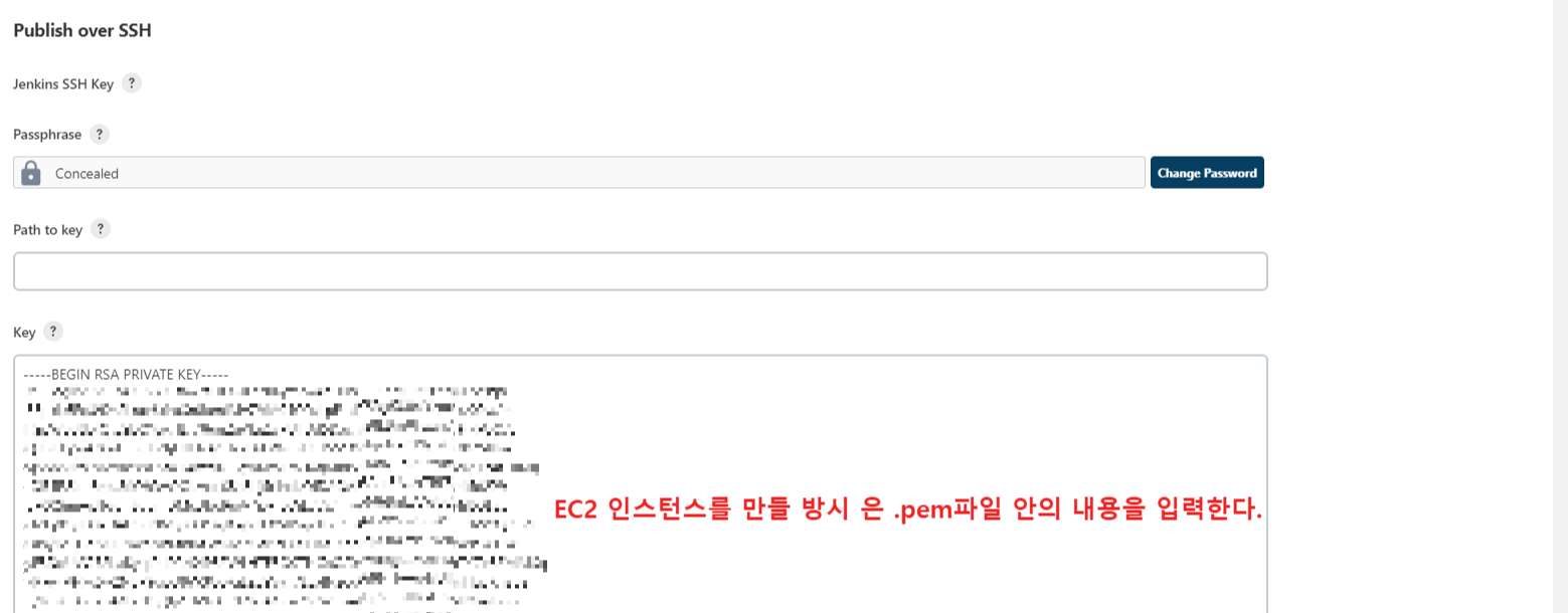 이어서 Jenkins 관리 -> 시스템 설정에서 제일 아래에 있는 Publish over SSH에서 SSH 연결할 EC2 설정을 진행한다.