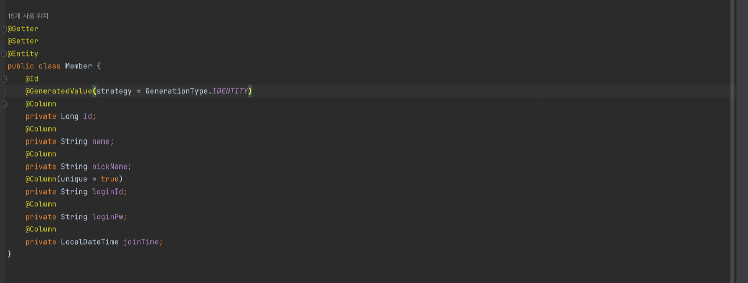 기본키(primary key)는 generatevalue를 통해 자동생성으로 하였다.