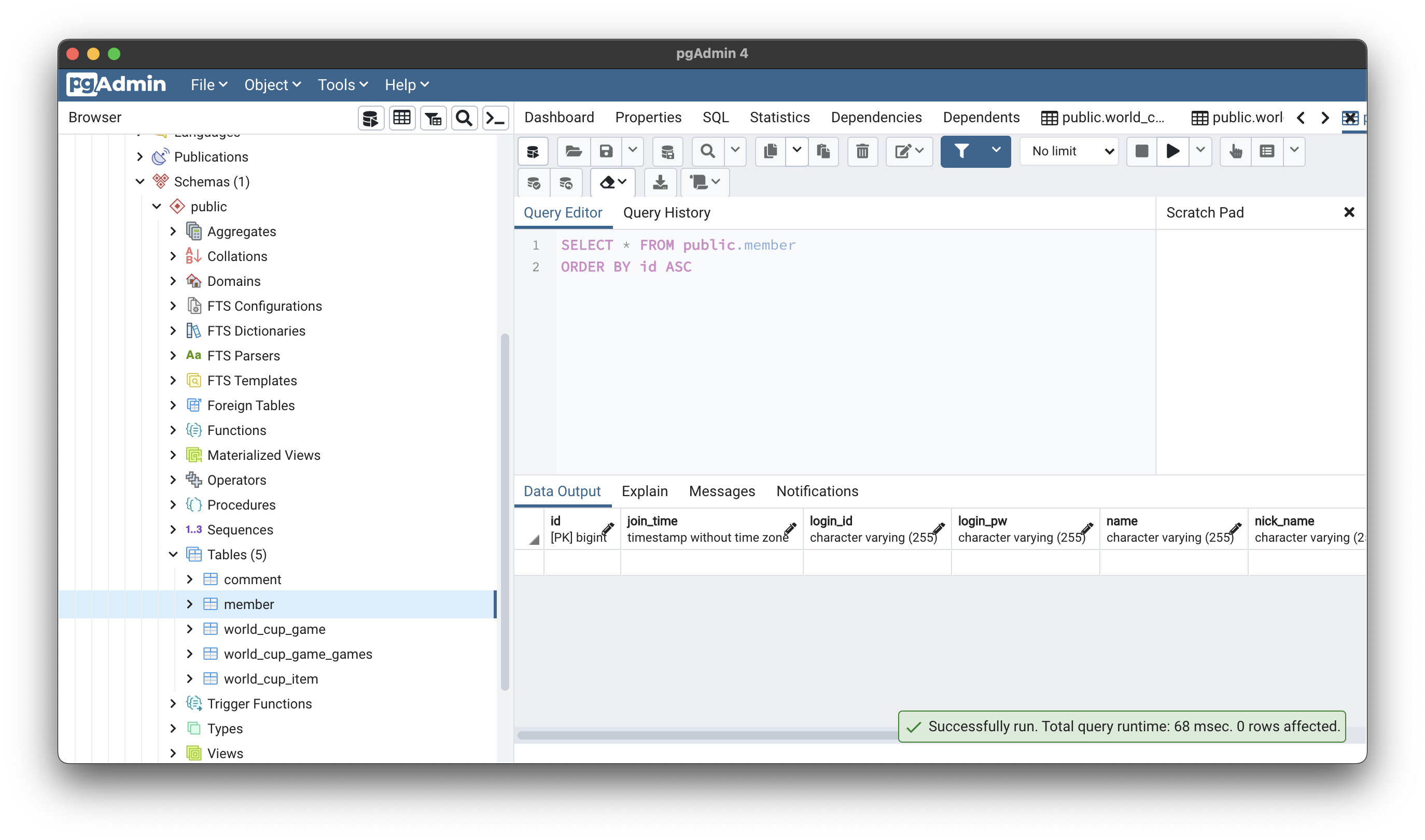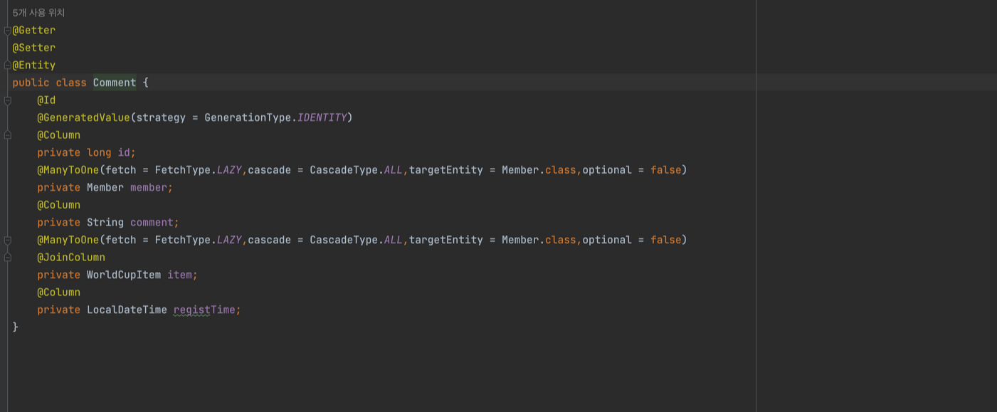 또한 JoinColumn으로 회원정보의 id 값을 WorldCupGame Table에서 Column으로써 가지도록 한다.